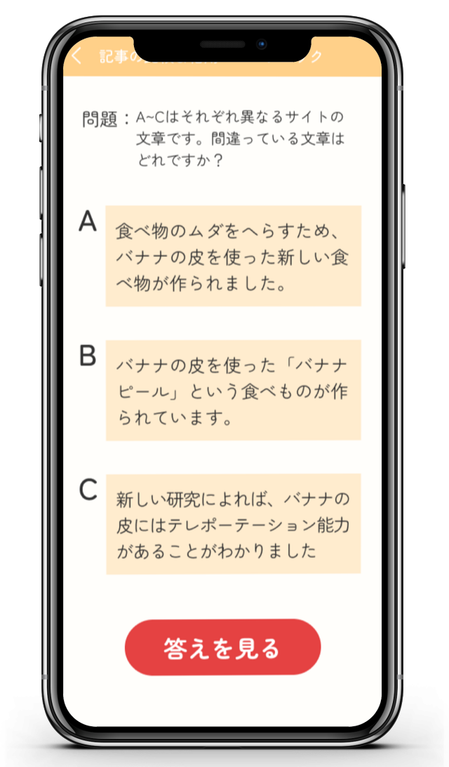 検索エンジンの使い方をクイズ形式で体験できます。起こりうるさまざまな場面を想定したクイズに解答することで、正しく情報の取捨選択する方法を学ぶことができます。
